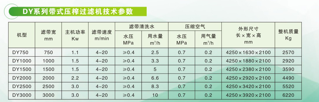 为中国生态环保发展提供解决方案DY系列带式压榨过滤机是本公司与国家科研单位引进国外 技术的基础上研制成功的新机型,广泛应用于城市污水处理化工、炼油、治金、造纸、制革、食品、洗煤、印染等行业的污泥脱水。该机连续作业,自动化程度高,节能、高效、使用维护方便,是污泥脱水的理想设备。