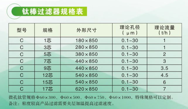 采用316L不锈钢材料作外壳,内部滤芯为钛滤管。耐高温、高压、强酸、强碱腐蚀,滤芯可反复再生使用。本机采用粉末冶金方法将钛金属粉末通过高温烧结的方法加工制成的空心滤管,广泛地应用于食品饮料、制药、化工等行业的液固分离,在制药行业尤其适用于大输液针剂生产线中的脱碳过程。