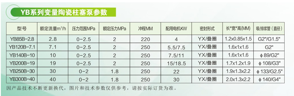为中国生态环保发展提供解决方案压滤机专用进料柱塞泵由液压驱动双缸陶瓷柱塞上下往复运动,来吸送含颗粒料浆,该系列泵特点是:可远距离输送或者配套压滤机过滤高含固量、高磨蚀性、腐蚀性物料,运转平稳、压力大、强自吸、长时间连续运转可靠性强。易损件少,维护简单。液体中固物含量可高达80%,颗粒直径2mm,排出压力可任意调节、设定。流量根据设定的压力自动调整,显著节能。